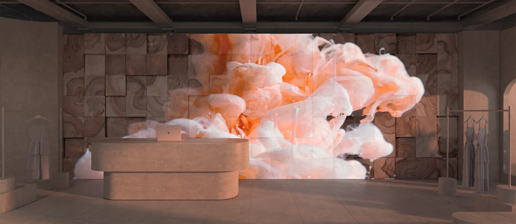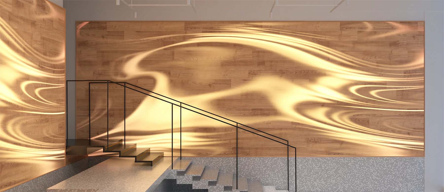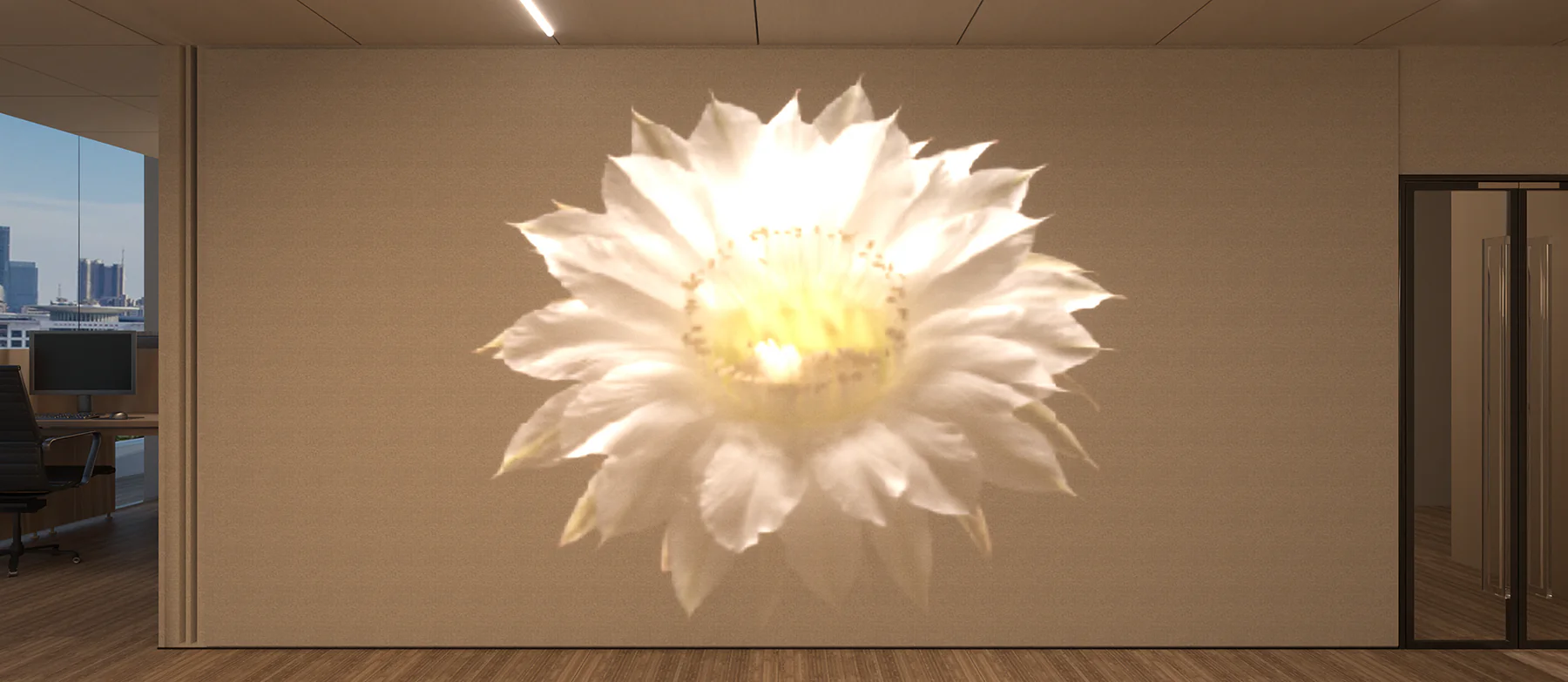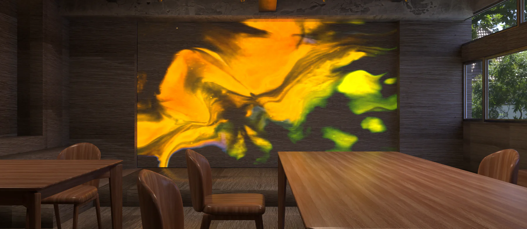 A luminous wall panel that integrates animated LED screens with natural textures.